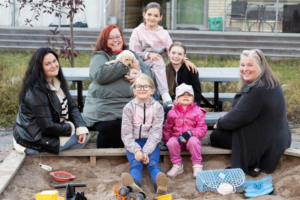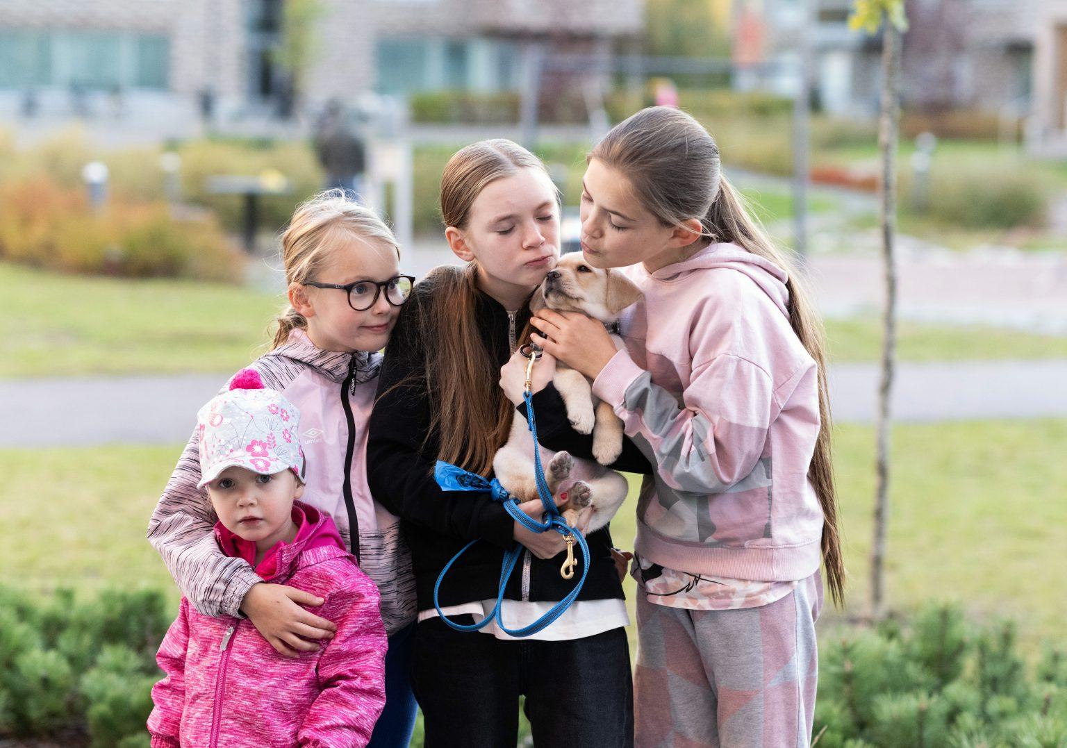 Tullivuorentiellä asuu paljon lapsiperheitä, Alisa, Aada, Emena ja Rafaela viihtyvät pihalla nelijalkaisen ystävän kanssa.